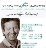 Bolesta Creative MarketingDieter BolestaFuchsstraße 665187 WiesbadenTelefon: +49 (0)611 – 811 00 18Fax: +49 (0)611 – 811 00 19mobil: +49 (0)171 – 600 300 6info@bcm-events.dewww.bcm-events.de