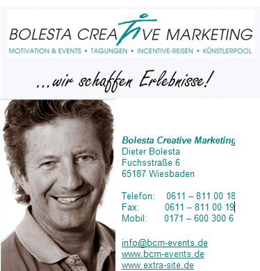 Bolesta Creative MarketingDieter BolestaFuchsstraße 665187 WiesbadenTelefon: +49 (0)611 – 811 00 18Fax: +49 (0)611 – 811 00 19mobil: +49 (0)171 – 600 300 6info@bcm-events.dewww.bcm-events.de